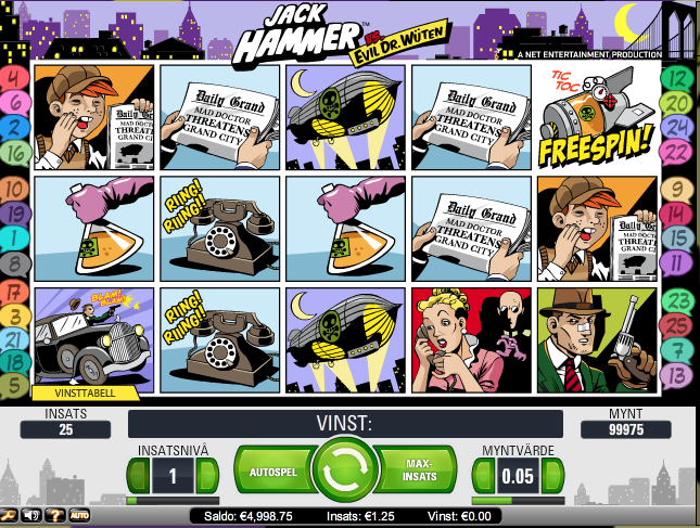 Jack Hammer är en av många riktigt bra spelautomater släppta av Net Entertainmnet. Net Ent har veckligen lyckats med att ta casino slots till en helt ny nivå. Från namnet kan man tro att spelet handlar om något slags verktyg, men det är helt fel. Jack Hammer är namnet på en kriminalare ” i denna 30-tals inspererade slot.